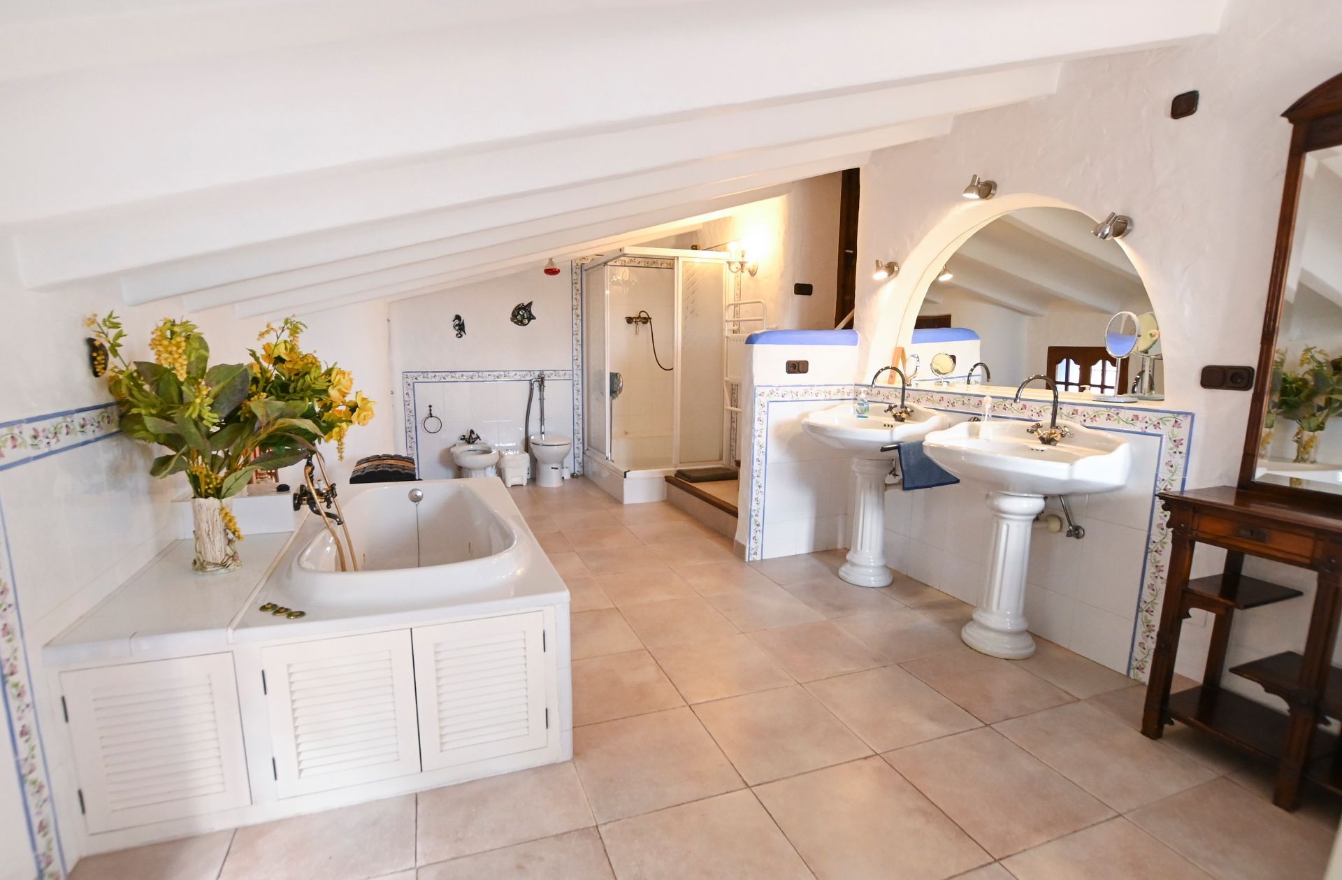Dormitorio principal de 36m² con aire acondicionado, televisión, armarios empotrados y acceso a una terraza con maravillosas vistas al mar. Desde el dormitorio se accede al baño en suite con bañera, ducha, doble lavabo, WC y bidet. El baño se encuentra bajo el tejado, por lo que cuenta con una zona de techo bajo.